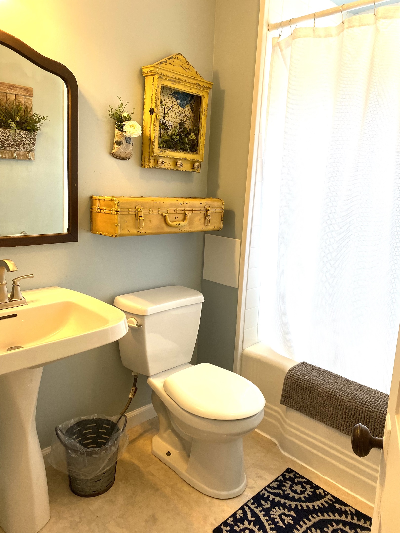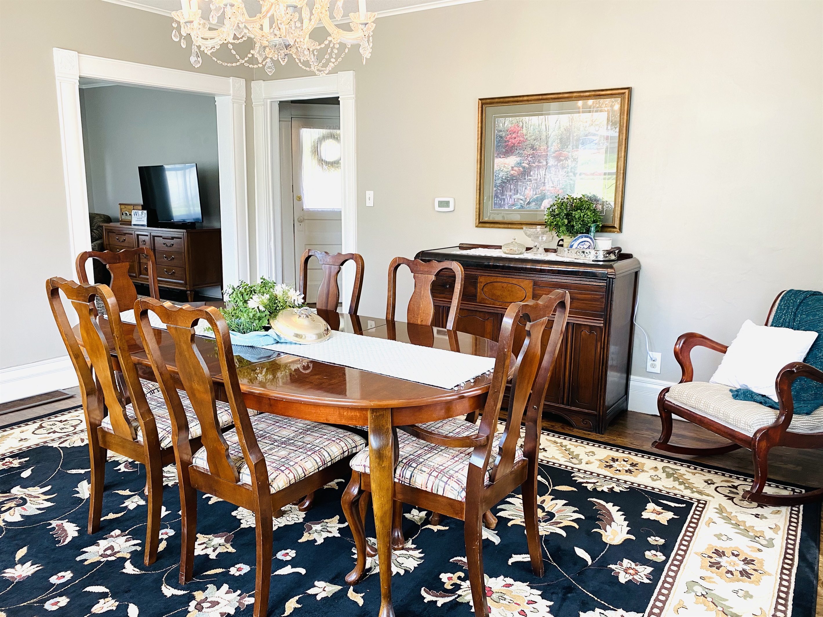 Enjoy coffee on the front or back covered front porches or walk downtown for a fresh cup. On the first floor you will find formal living and dining rooms, updated kitchen and full bath with shower-over-tub. The living room features a sleeper sofa, comfy chair, smart TV, vintage radio with record player, games, and a library. A gorgeous glass chandelier will greet you in the formal dining room which has seating for eight as well as a window seat and dedicated workspace with desk, lamp and adjustable height chair, and router. Our farmhouse kitchen is fully stocked and room at the island for a quick breakfast or extra helpers to sit and chat.